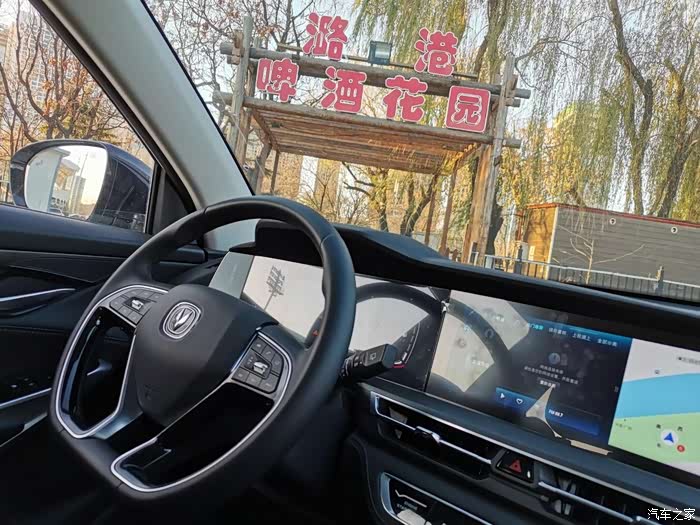 本来想多拍几张外观的,不过天真的是太冷了,只好作罢,赶紧躲车里暖和暖和。每次一坐进车里,感觉真心好。液晶仪表和中控大屏连在一起组成的贯穿横屏特别有那种科技感的氛围,而且这两块屏幕的角度是一种类似于曲面的效果,主驾驶看过去的角度都是最合适的。