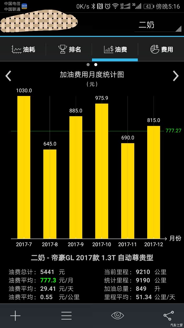 提车半年来月度油费分析,每月平均油费分析
