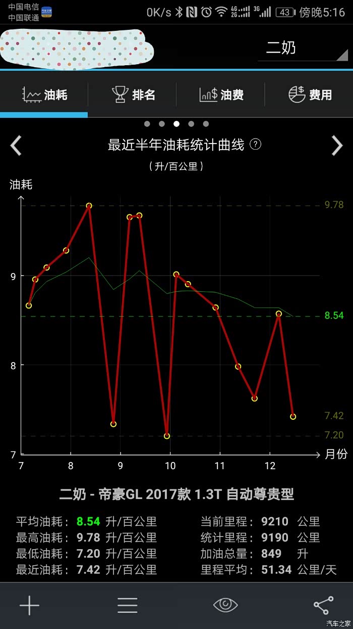 油耗方面是比较满意的。半年如下: