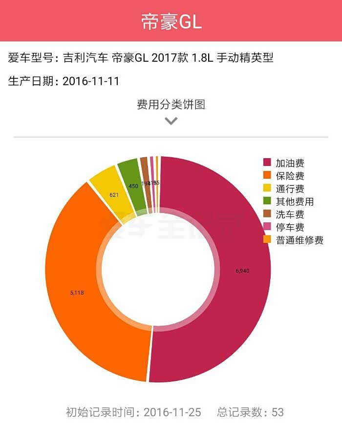 以下数据是记录了整个用车车的费用,从去年12月1号提车。到今天,已经11个月了。每次加油都没有漏掉,记录得清清楚楚。截止到上一次加油。总共加油费用为6900多块钱。总行驶里程13500多公里。从下图图表可以看出,汽车费用占比比较大两个项目,一个是油耗,一个是保险费用。保险费用,因为是第一年购车。当地4s要求要在店里面买。所以保险相对比较高,第三者50万,商业险加交强险加车船税,总共5100多块钱。