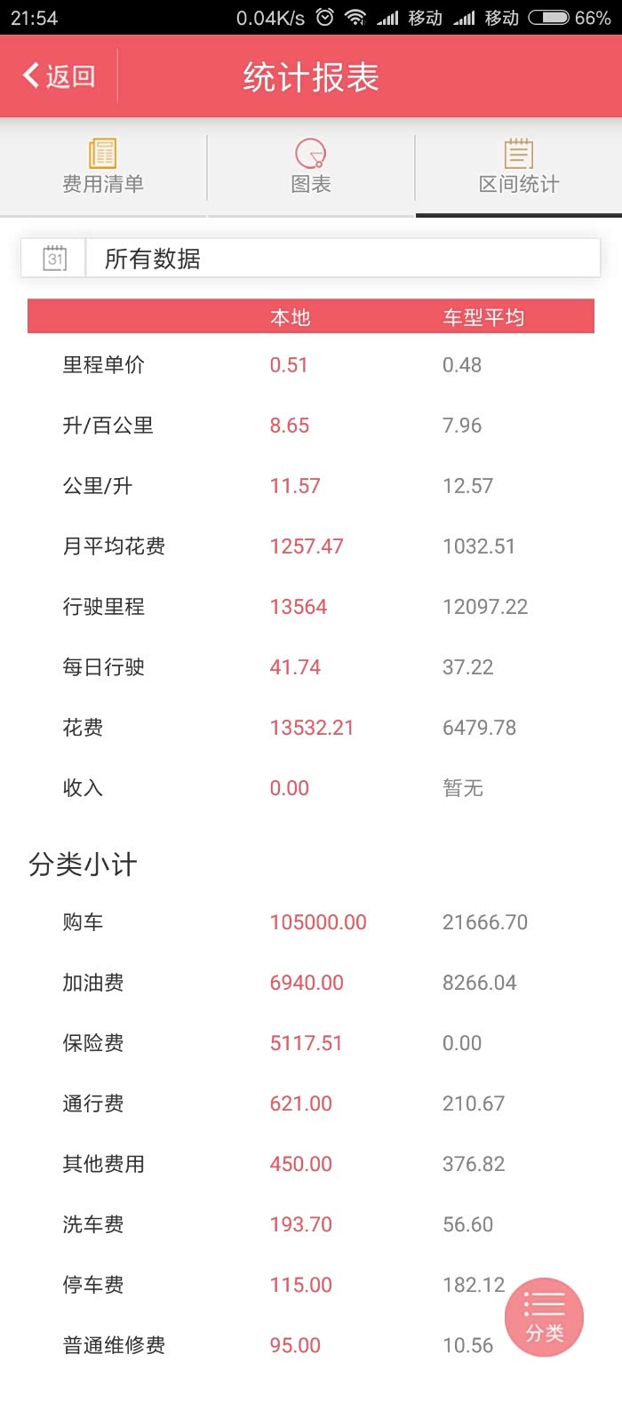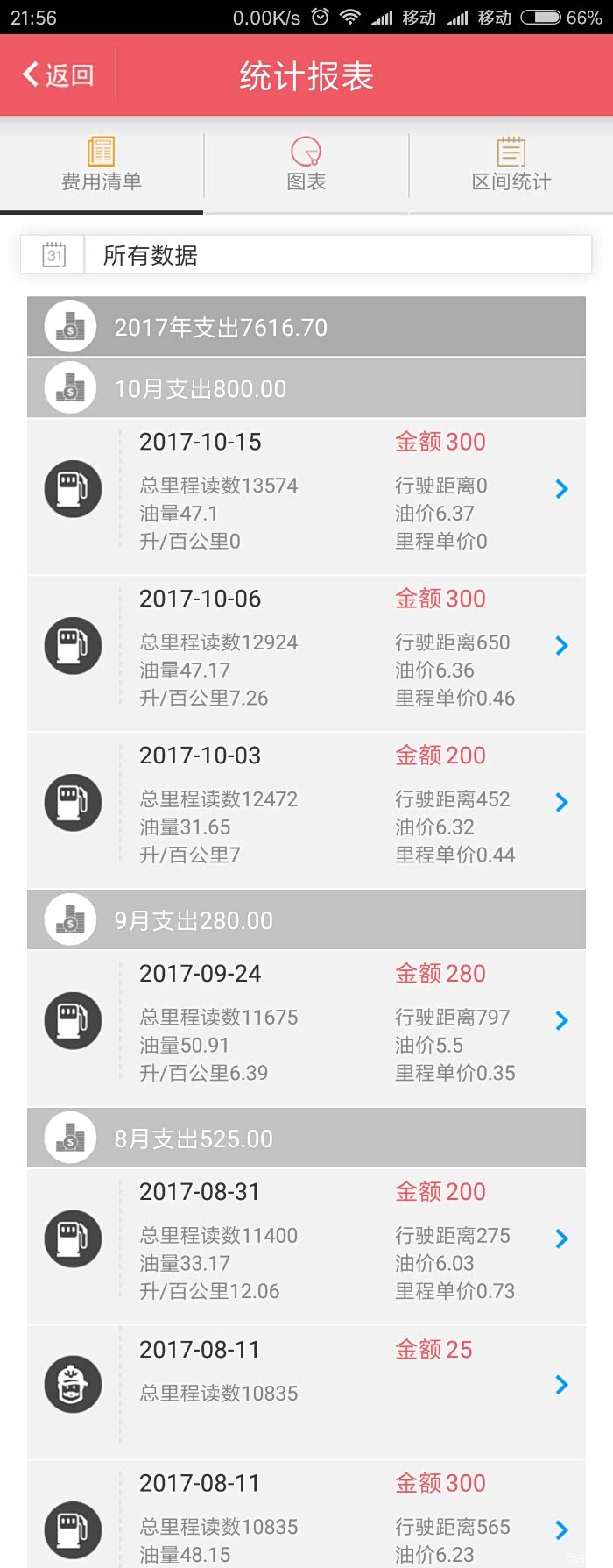 平均油耗在8.65,平均里程单价0.51。月平均花费是包含了保险,所以月平均花费比较高。大家可以剔除掉在计算。软件记录还是很精准,也很详细的。百公里8.65的油耗,对于1.8升的自然吸气发动机来说,还是可以接受的,毕竟我跑市区的时间比较多,基本上80%的里程都是在跑市区。高速油耗相对低很多。