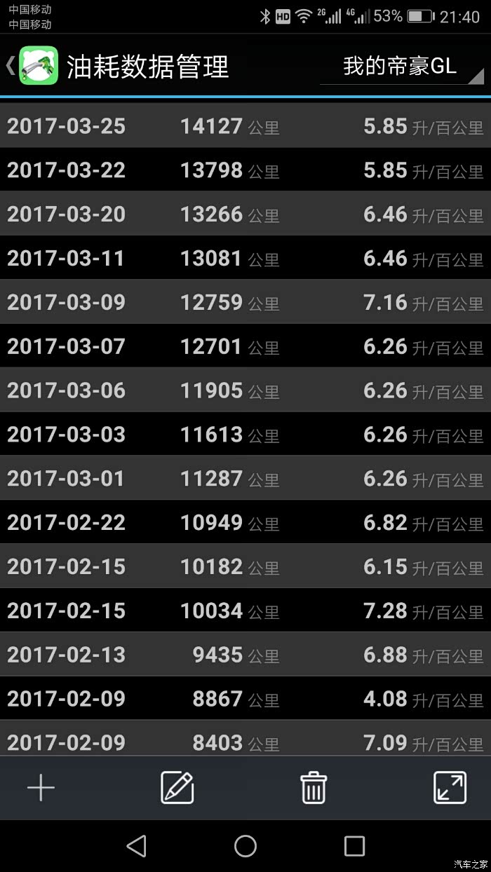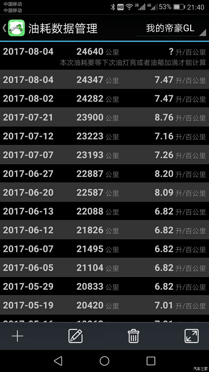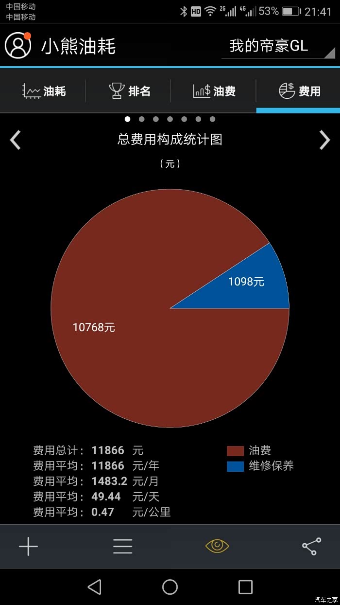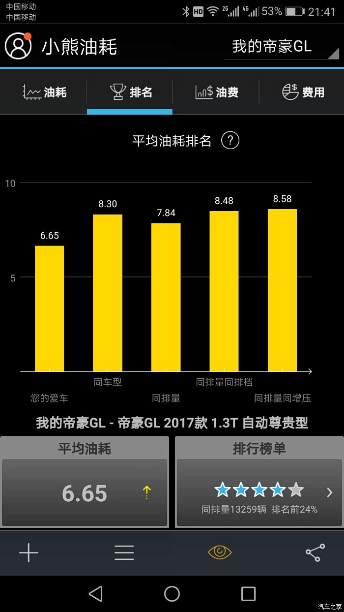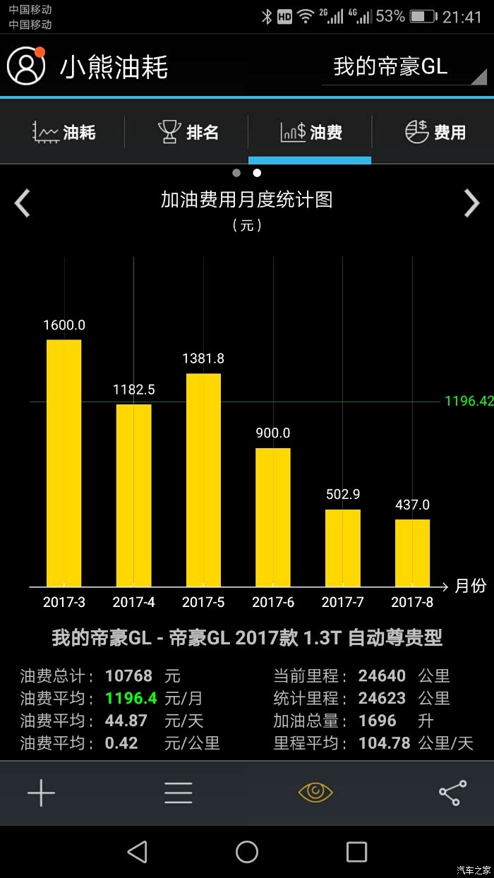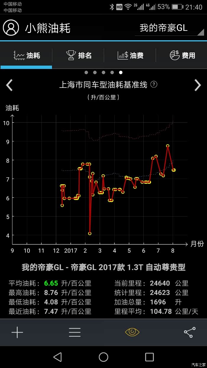 每次加油都是在中石化加的,都会在小熊油耗上记录,所以这是最真实最准确的实际油耗。油耗的高低是由很多因素决定的,不仅仅与车本身有关,还与个人驾驶习惯,行驶路况,天气因素等都有关系。OK,暂时就这么多,总体来说,帝豪GL的表现没让我后悔,感觉还是物有所值的。
