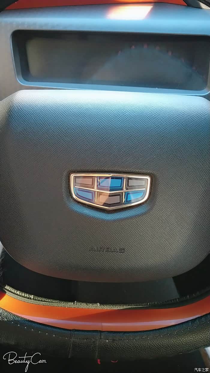 方向盘上吉利远景的标志。黑蓝相间六块大腹肌。买车这么长时间了,我第一次找到了主驾驶的安全气囊。这可能也就是人们常说的。最显眼的地方是人们最忽略的地方。AIRBAG天天在我眼前居然不知道这是安全期气囊。