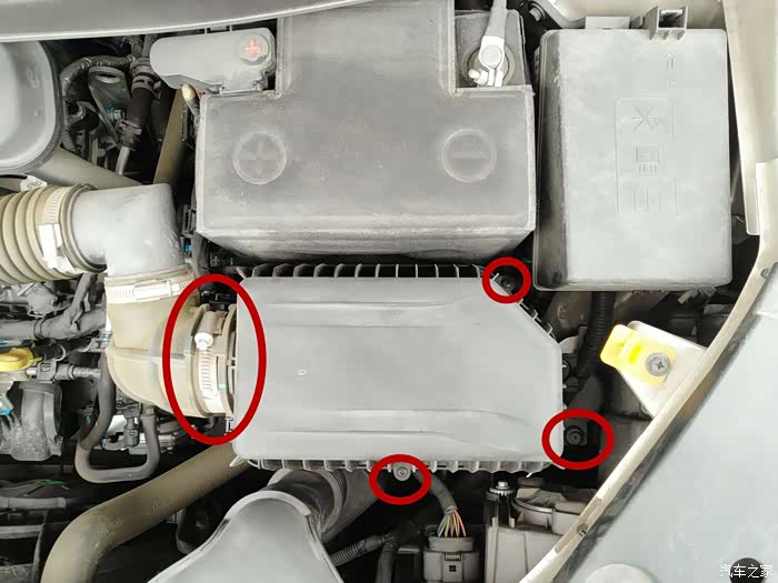如图所示,想要拆掉空气滤芯的外壳,首先要松开这四颗螺丝,左侧的紧固环螺丝松开即可,右边的螺丝则需要完全拆下来。