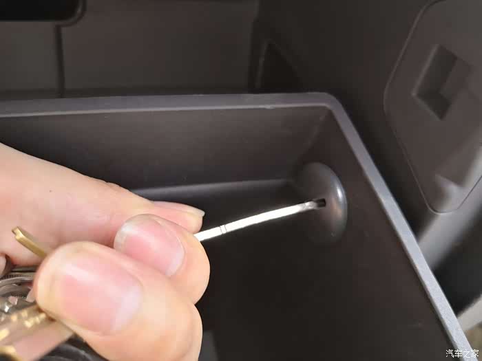 第二部:拆除扶手箱内划到螺丝,如图所示用平头的钥匙沿逆时针方向旋转。