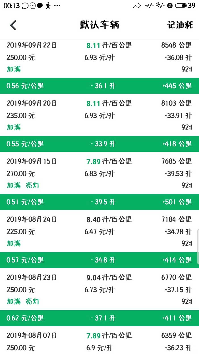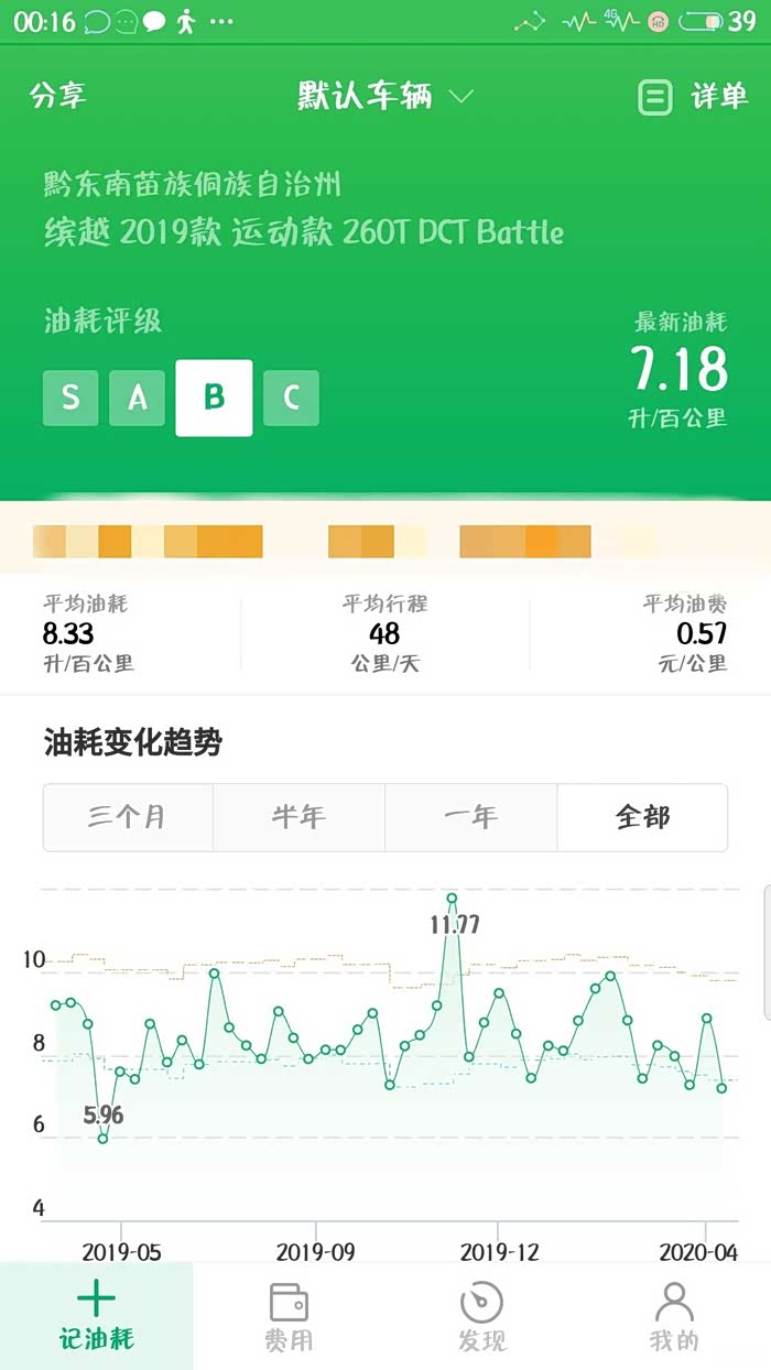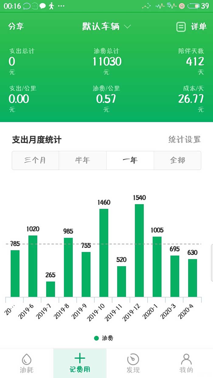 先来一组我的数据:412天19000多公里,累计加油1611升,油费总计11030元,平均一天48公里,平均一天的成本是26元,平均8.3升/百公里,0.57元一公里,最高11.7升/百公里,最低5.96升/百公里。