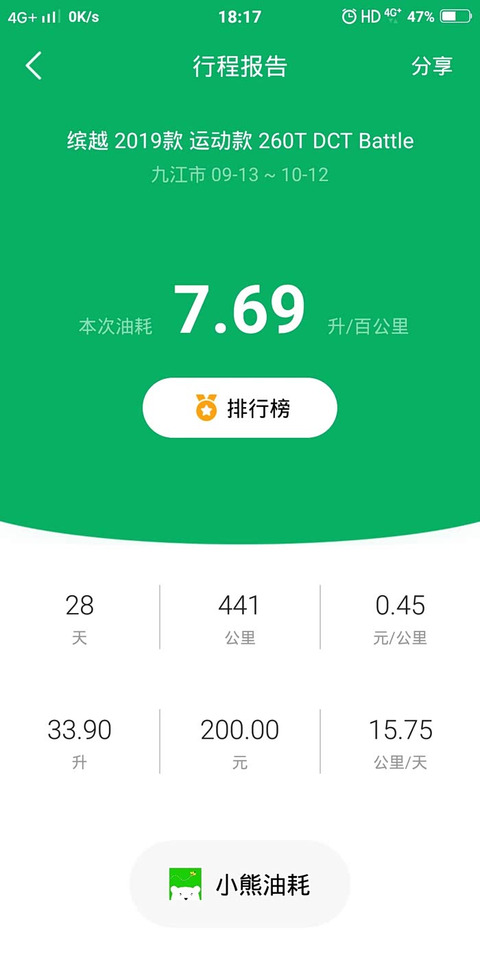 缤越,我跑了差不多一万公里,从新车2000公里自己就开始使用软件记录油耗了,对于车子的油耗自己最深切的体会就是说,“车,还是要看人开的”。当初我刚买车回来,很多朋友都有和我提过这车肯定油耗不会低,确实,毕竟是款SUV而且还是大家口中的“国产”。不过驾驶这么久了我正常情况下都是五毛多不到六毛,最最最便宜的一次200块钱跑了400多公里,也就是4毛多一公里。确实是惊到我自己了。看看其他缤越车友动不动就10个油以上,心里真的是暗自窃喜。