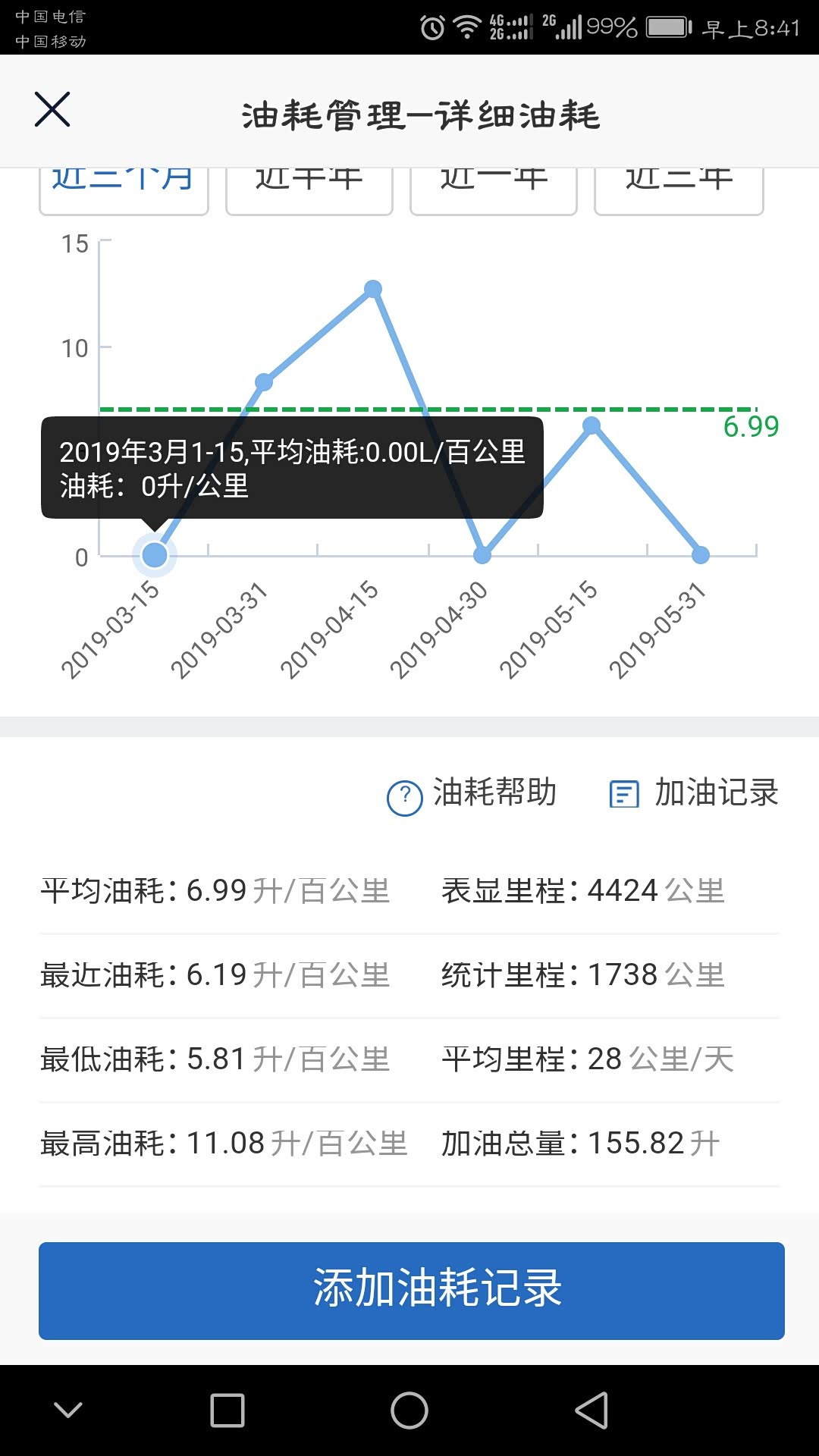 油耗一点一点下降,因为最近没怎么开车,所以不存在堵车,油耗有所下降。