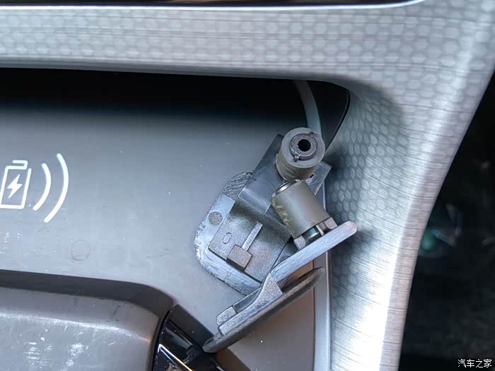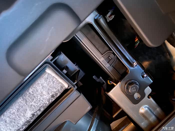放下面手套箱,看到这个盖板。最右边也有个卡扣,往左边压一下,往上掰就能够出来