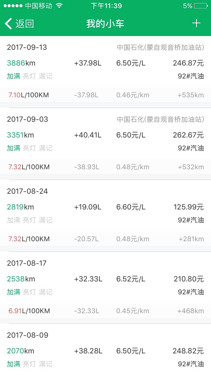 我是9月3号油耗还差一格时候去加的油,我有油卡都是同一个油枪加到跳抢。加满油是3351公里显示。然后跑了只剩下一格油,又去同一个油抢加油,里程表显示3886公里,综合油耗7.1升