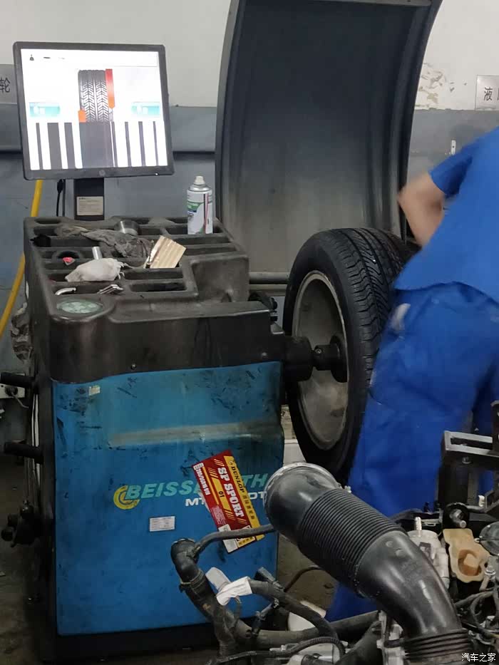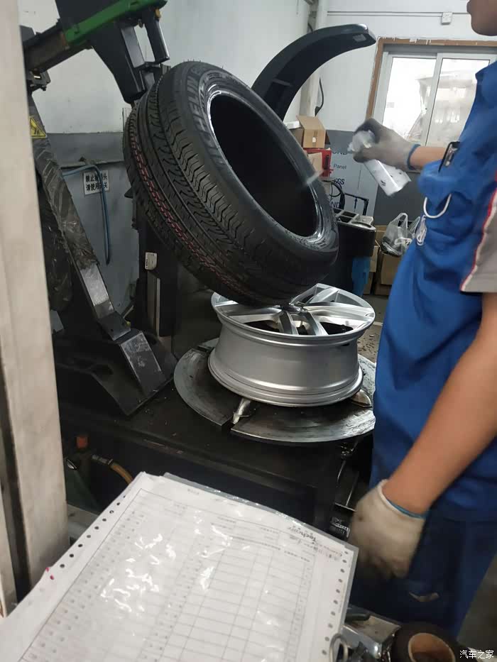 换上新轮胎,另一个师傅开给新换的轮胎做动力平衡,换新轮胎一定要做动力平衡,因制造轮胎时由于材料和技术的原因,轮胎各部分的分布或多或少存在偏差。只有通过动力平衡机读取数据,再通过铅块的数量和质量使轮毂和轮胎内外达到质量平衡。如果动力不平衡,车辆行驶时可能会发生车身摇动,方向盘抖动及轮胎磨损不平衡,影响行车安全。