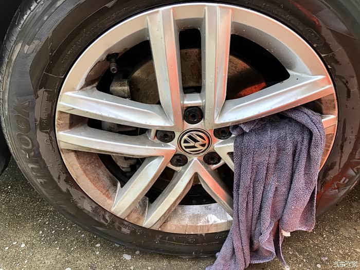 还是赶快洗洗把,再看看这个轮毂,真是黑的不像话了,虽然说经常下雨,但是轮毂里一点没有冲洗掉,这个应该是刹车盘经过刹车