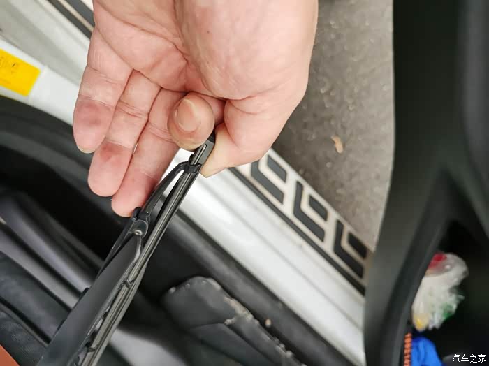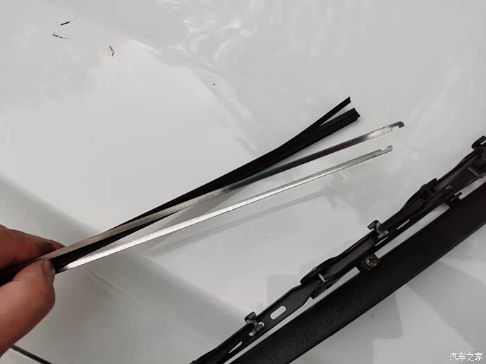 取出原车的雨刷器开始更换胶条了,这个雨刷器一年没用了,上面的胶条也老化开裂了。