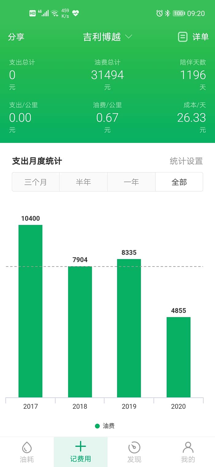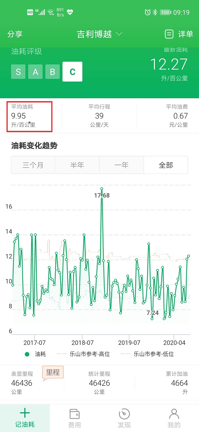 三年多的油耗,四驱车,平均9.95升百公里。感觉还是不错了。毕竟那么重的车。表显里程46436公里。高速市区一半一半吧。