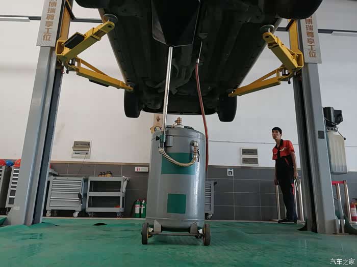 工作人员拉来回收旧机油的桶子,开始放掉旧机油