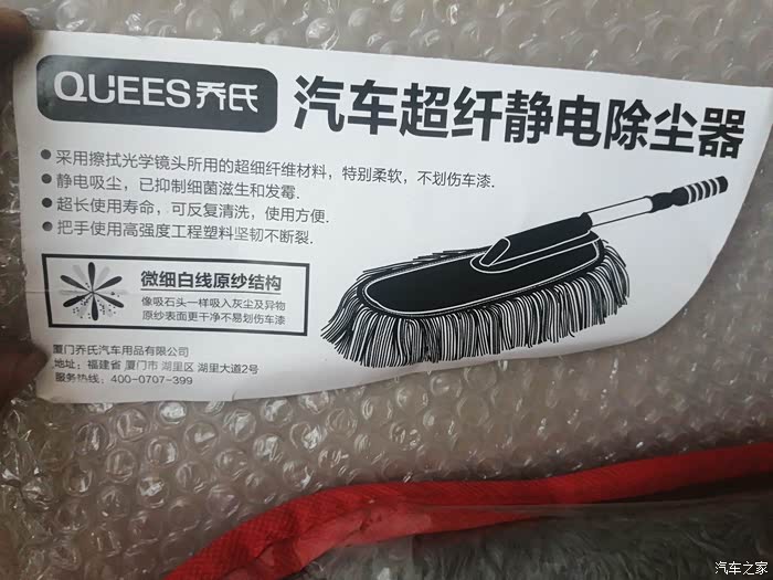 大家好!很快就收到这款乔氏汽车超纤静电除尘器,它就和平时使用的蜡刷是一样的,这款除尘器的毛长10cm,毛的材质是超纤维材料制作,特别柔软,不会划到车漆。它内里仿毛材料制作,把手采用伸缩把杆,这款除尘器微细白线原纱结构,能像吸石头一样吸入灰尘及异物,原纱表面更干净易划伤车漆,除尘器毛头可以考虑定期更换。