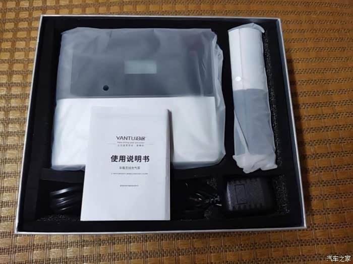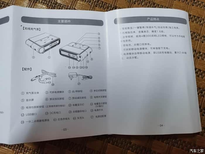 产品包含充气泵主体、可拆卸电源模块、电源适配器、一分二点烟器电源线、产品说明书和气泵配件