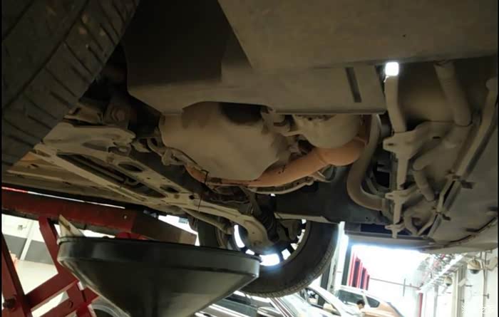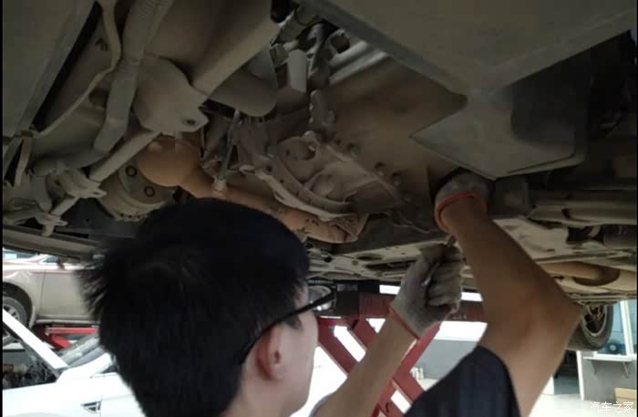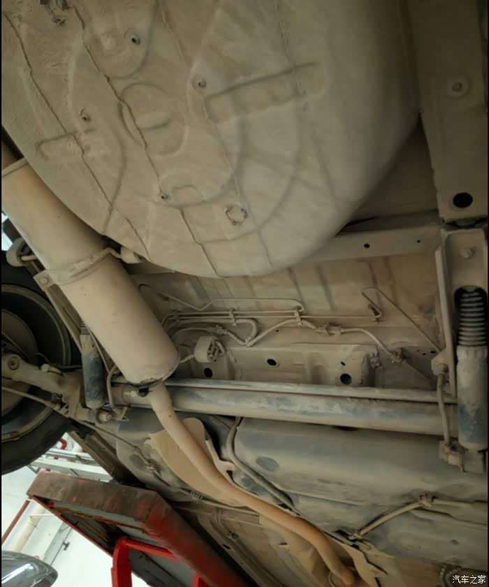 很久没好好的看看车底了,升举起之后拍了一张。车底各方面看着都挺好,其实我也看不懂。工程师说没什么毛病,避震不漏油,螺丝也没有哪里松动。