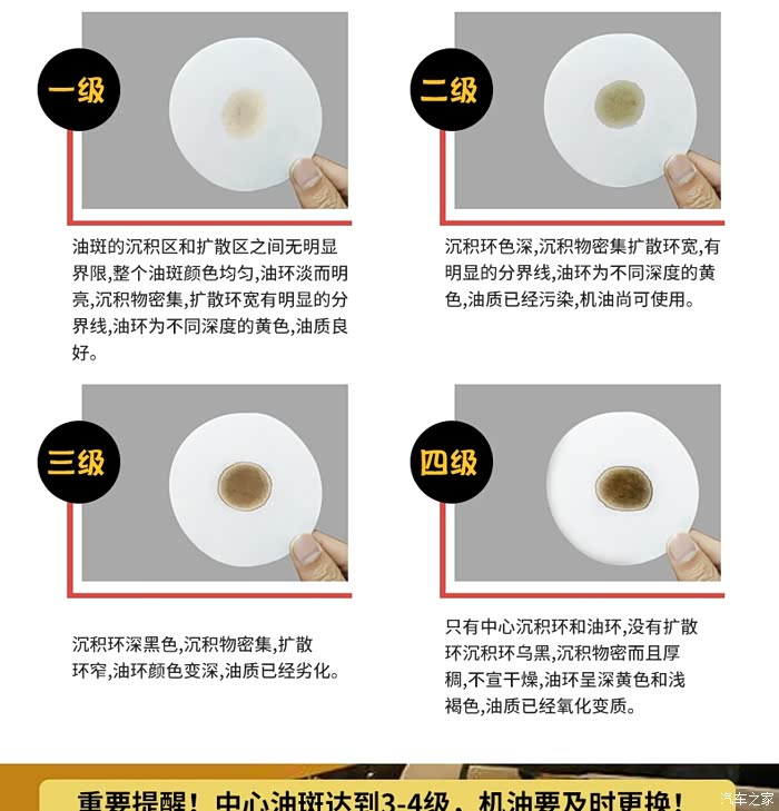 机油的好坏可以通过简单的机油定性滤纸进行测试,原理我不太懂,不过可以直观的看得出来,,以滤纸的中心为焦点向四周扩散,由内向外,如果出现有分层且颜色不至于那么“黑”说明机油情况尚好,如果没有层次且黑乎乎一片吗,那么恭喜你,改换机油了。