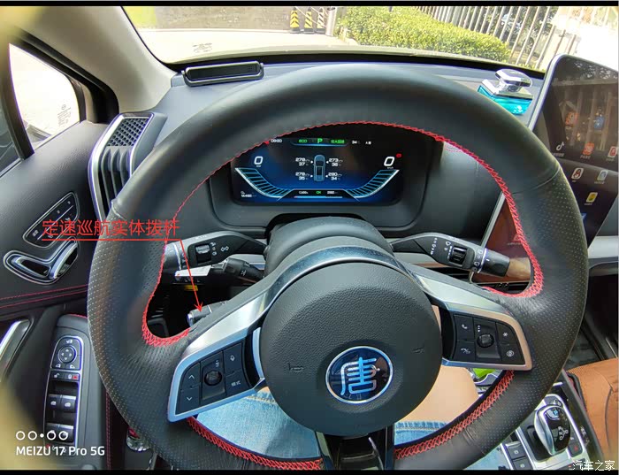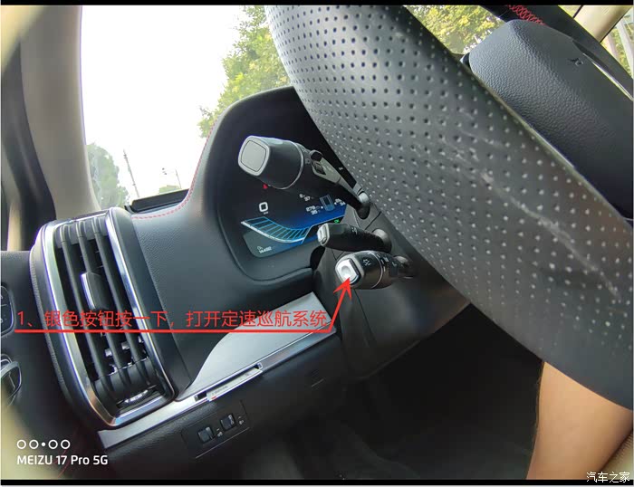 银色按钮摁一下,就能打开定速巡航系统了,拨杆向上抬一下就可以以当前速度定速了,然后向上下轻抬速度+1,重抬至上下整十数字。