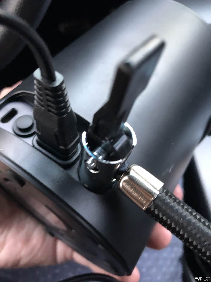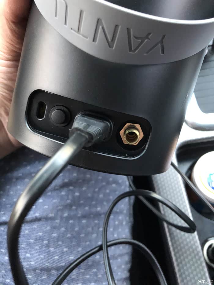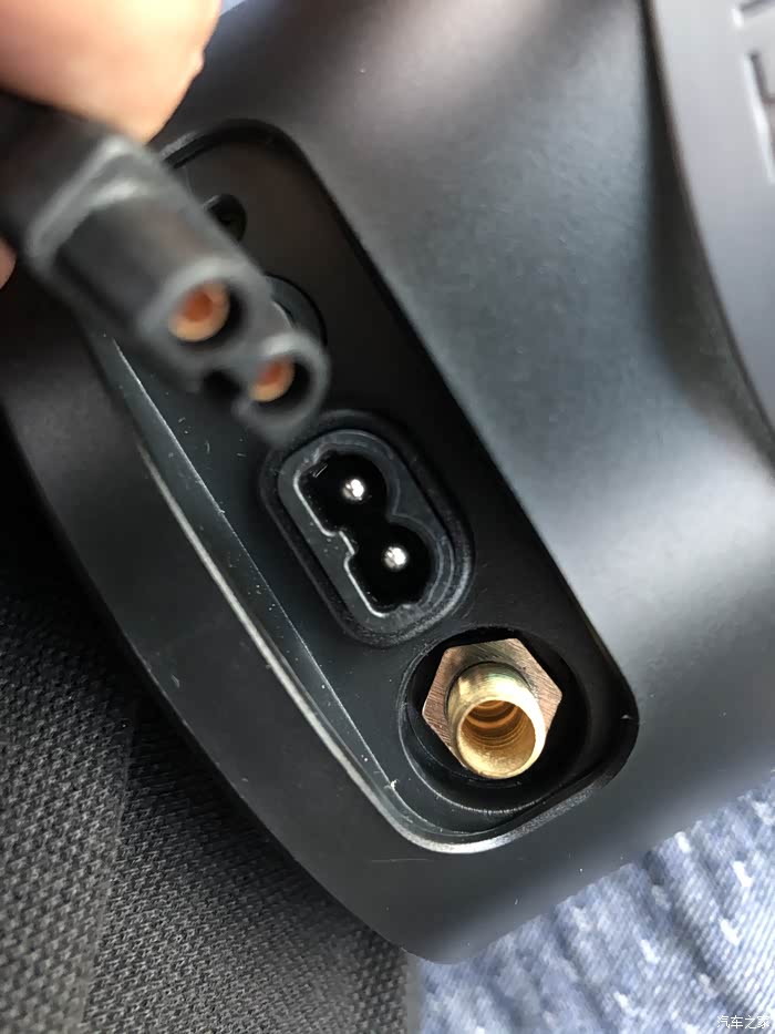 左边第一个孔是无线版的USB接口,由于我这款是有线版的,所以第一个孔缺失了,第二个是充气泵的开关,第三个是充气泵的点烟器供电连接口,第四个是气嘴连接孔