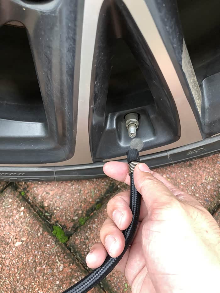 气嘴连接也很简单,不按压的情况下,轻轻放下去,可以给轮胎放气