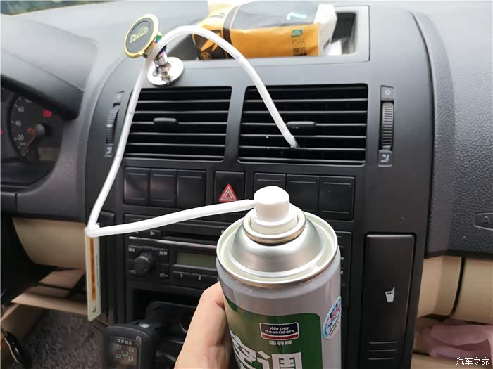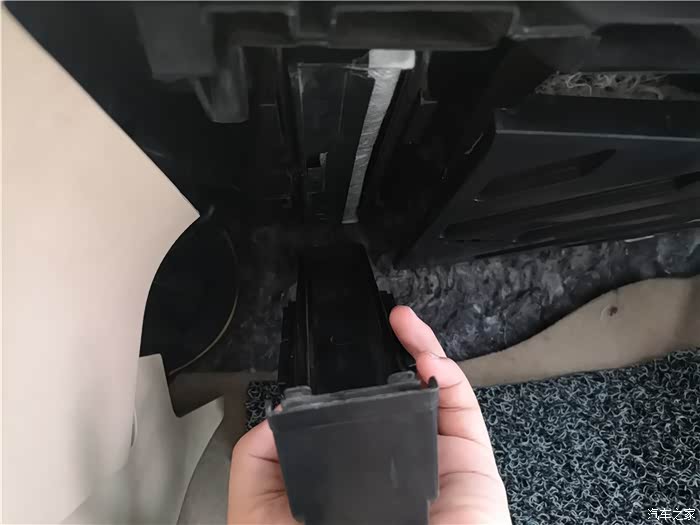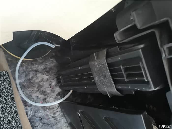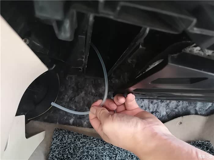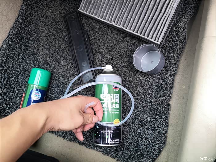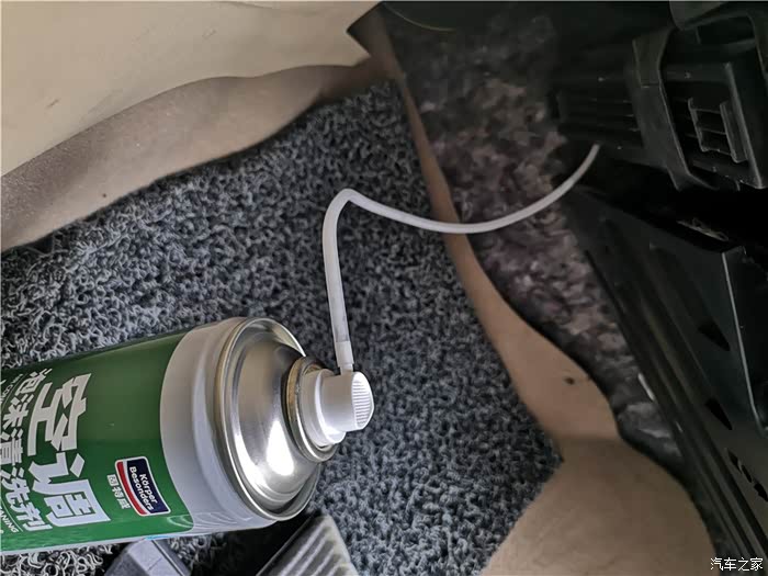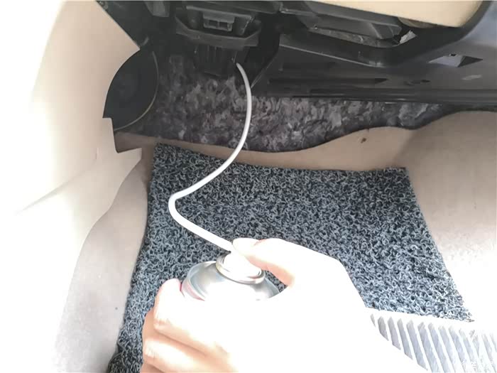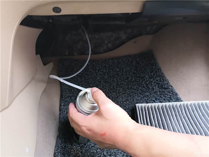 管子从空调滤这里面往里伸进去,很多人直接出外置空滤口喷进去,其实这样是不好的,一方面,喷进去的会喷到鼓风机,造成鼓风机进水短路损坏,另外一方面,清洗的管路太长,重点是清洗蒸发箱,所以要喷到蒸发箱才是最好的。