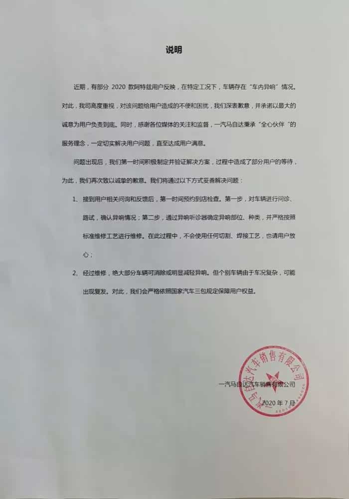 针对于此,近日一汽马自达官方发布说明,承认“车内异响”问题,并表示将会对部分2020款阿特兹用户反映的“异响问题”进行妥善解决。