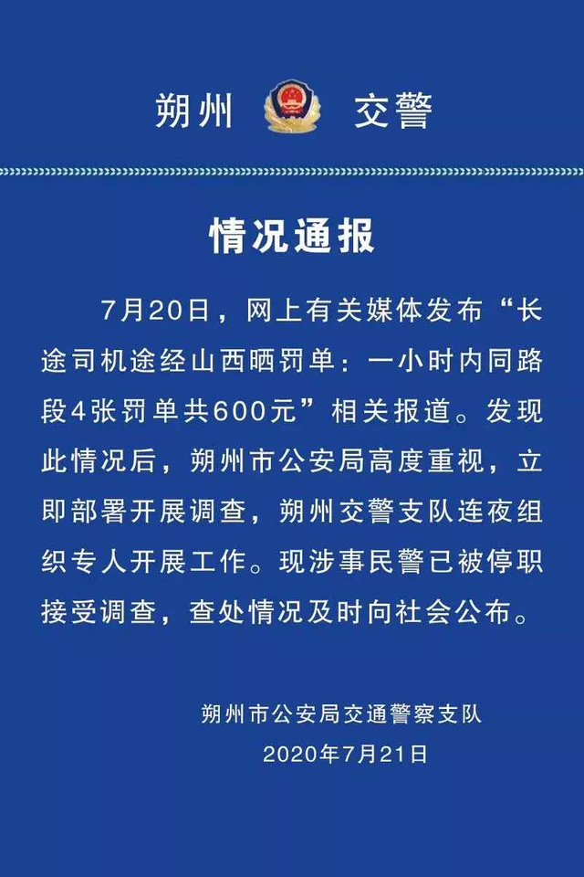 近日朔州交管冲上热搜,根据媒体报道是一位货车司机几个小时内被开了四张罚单。