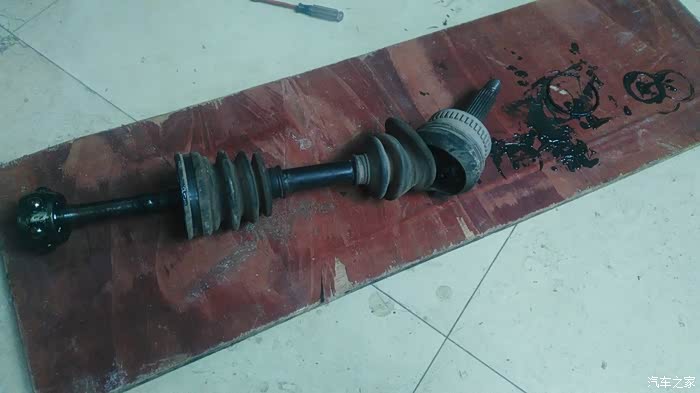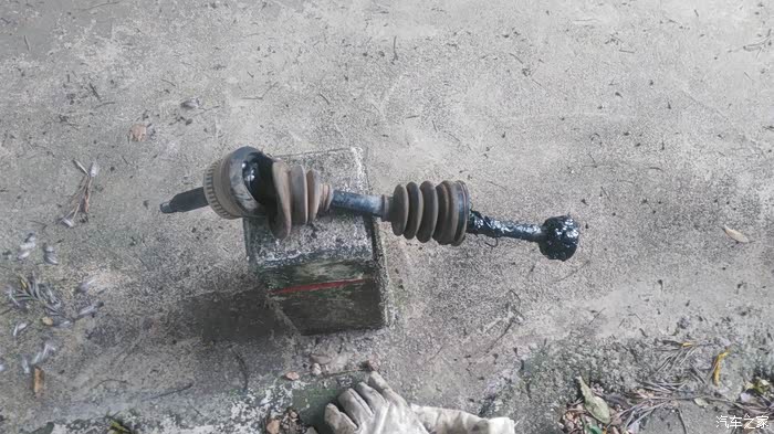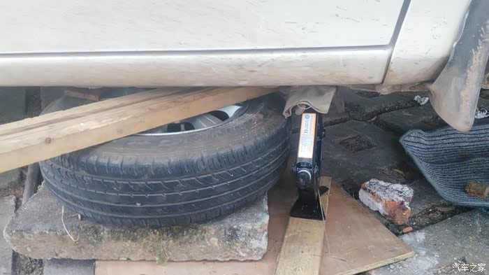 找两块铺地的水泥格子砖把两个前轮支着就行,试了下能钻进车底。工具不用多:随车的千斤顶、换备胎的扳手、30的套筒、17、18梅花扳手、T10套筒、小的一字起子。为了绝对的安全,人钻车底前,必须四个车轮全部是不拆下,万一千斤顶侧倒,四个车轮正常支着车身,非常安全。我只用了两块60X60x12的水泥砖顶着两个前轮,后轮用砖头止退,手刹拉紧。非常非常重要的一点:先把右前轮的螺丝(包括中间的30#大母)拧松,不要取下来,再用千斤顶支着门槛,右前轮能自由转动就行,方便在车底转动轮子拆防尘罩的抱箍。