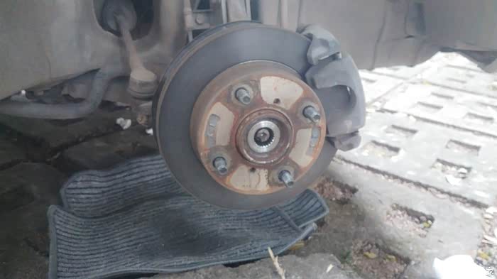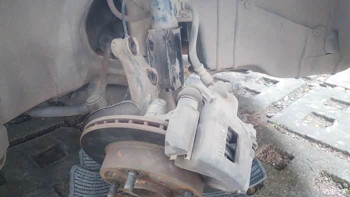 把右前轮拆下,30#大螺母也拆下,减震器下端两螺杆拆下。注意:用T10的套筒把ABS传感器固定在减震上的螺丝拆下,以免传感器扯断线。