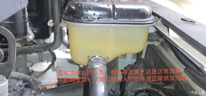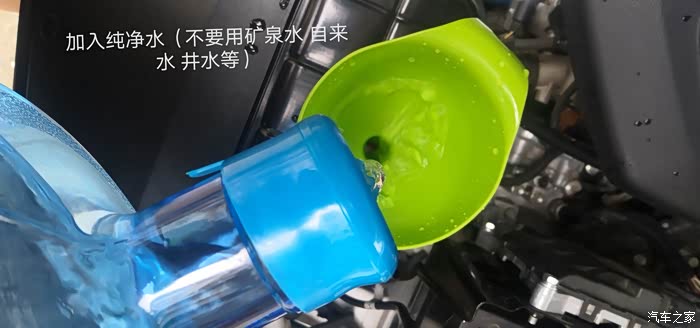 然后开车出去溜达一圈回来!你会发现液面还会继续降低!这个时候我就用没喝完的半瓶纯净水倒了进去
