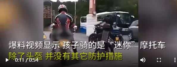 爆料视频显示,孩子骑的是“迷你”摩托车,除了头盔,并没有其它防护措施。