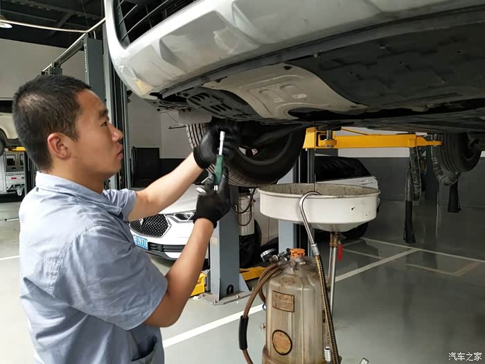 技工师傅拆下护板,准备放机油