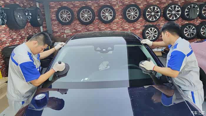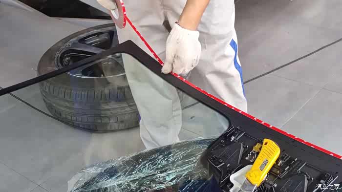 这时就可以清楚的看到玻璃上均匀厚实的玻璃胶了,眼见为实 新玻璃就位