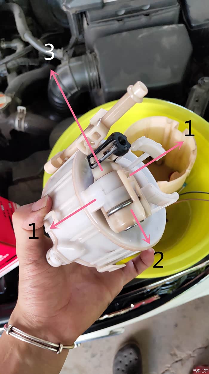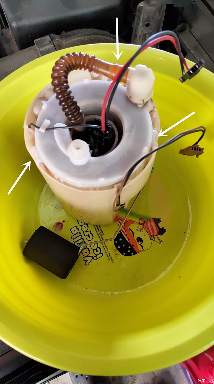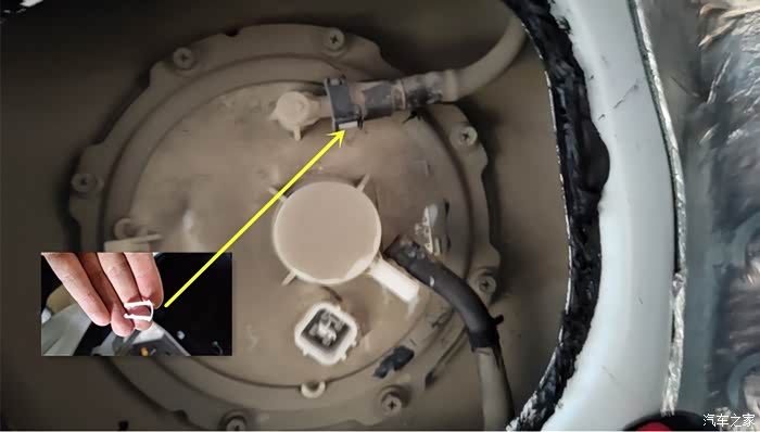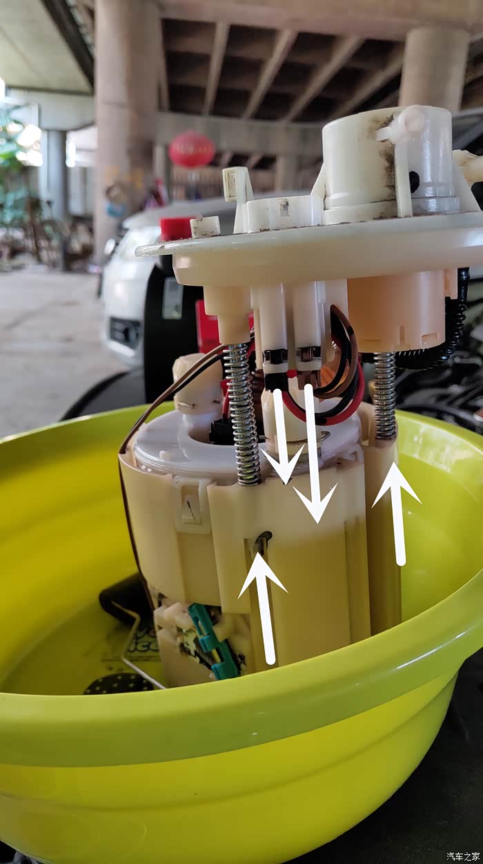 图中黄圈就是两个卡扣的地方,中间的就是燃油泵的位置了。