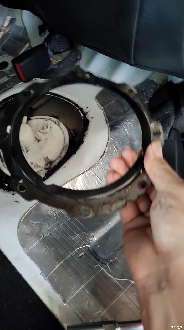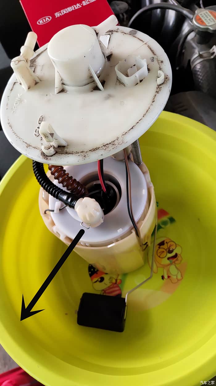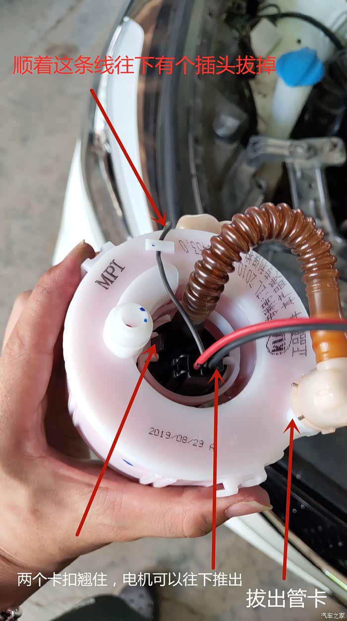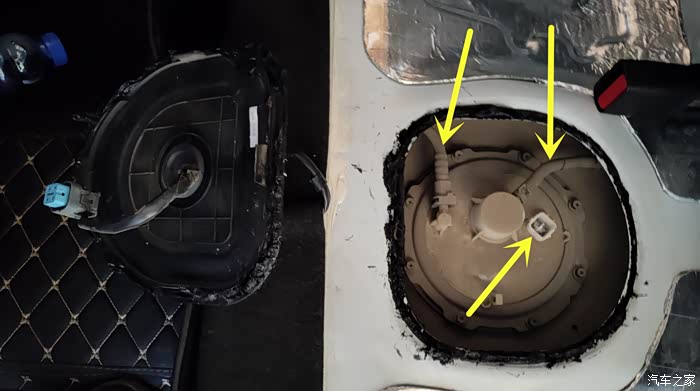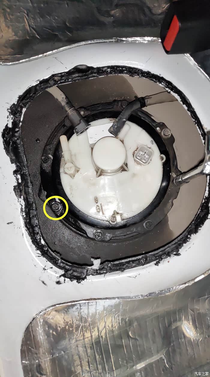 图中黄圈就是两个卡扣的地方,中间的就是燃油泵的位置了。