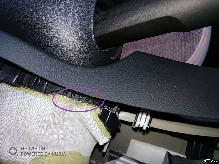 这个磨具这里有毛边,应该是磨具的问题也是造成很多人说仪表盘会有缝隙不匹配的原因,很多人安装不注意这里用刀子削掉就服帖了。还是磨具不够精致吧