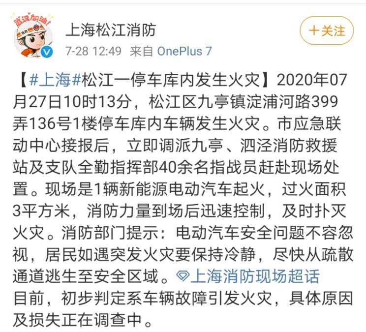 近日,上海松江消防官方发布消息称,2020年07月27日10时13分,上海市松江区九亭镇淀浦河路399弄136号1楼停车库内有一辆新能源车发生火灾,市应急联动中心接报后立即派出指战员赴现场处置,及时扑灭火灾。目前,上海松江消防初步判断系车辆故障引发火灾,但具体原因及损失还在调查中。