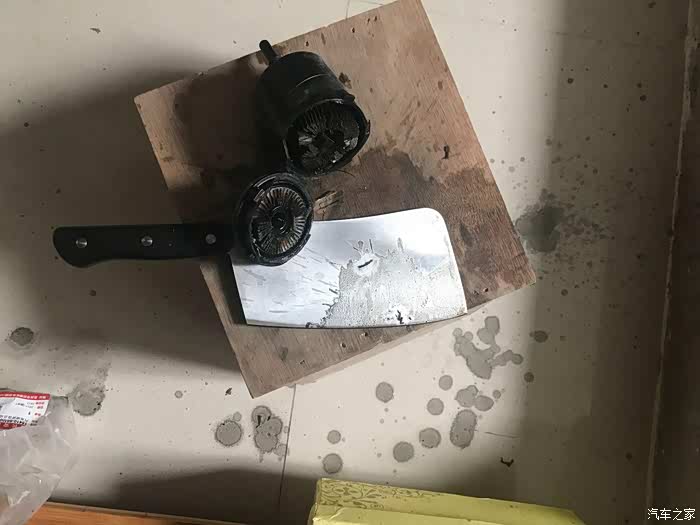 换下的汽油滤带回家,找来剁骨刀,一刀砍成两半,简单,粗暴