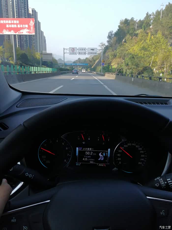 左把仪表盘上的里程表1的里程数复位到0,就这样开始吧。L档出发,1.5吨车重,1.5T发动机,起步是有点儿慢,但本人多半时间都在跑高速,而且也不是飞车一族,发动机转速上1500rpm,车速起来后,涡轮一介入,对我来说完全足够。过了收费站切换到D档。一开始的油耗10升/每百公里。这车才500多公里,所以在磨合期我操控它是很温柔的,从来不会一脚刹车一脚油门,而且高速上最好车速控制在90公里/每小时,不知道是不是强迫症,在遇到慢车、车多时也在70公里/每小时,这样才会控制油耗最经济。