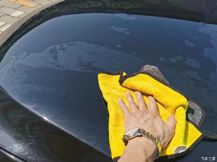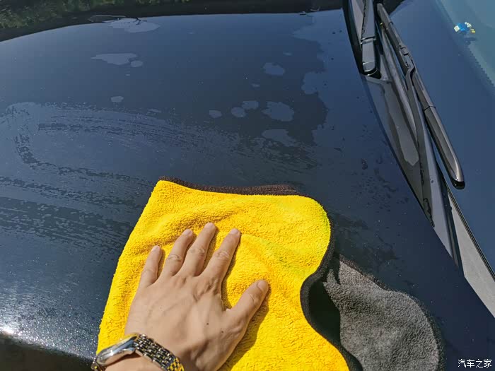 洗干净后就得擦车了,擦之前涮涮擦车布,我一般都是把抹布放在一个干净的台子上,然后用水枪喷洗车布,这样会把布上的杂质冲干净,以免擦车时候滑伤车漆。
