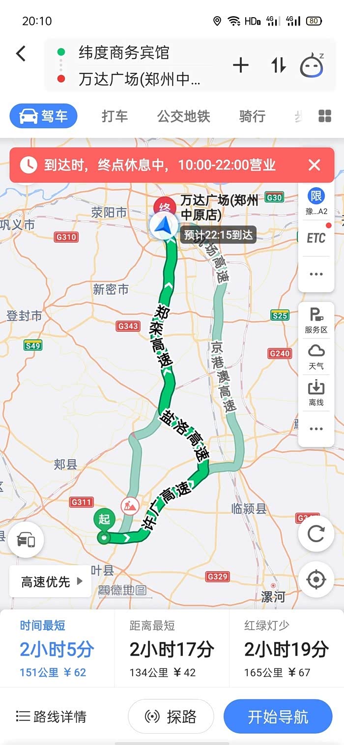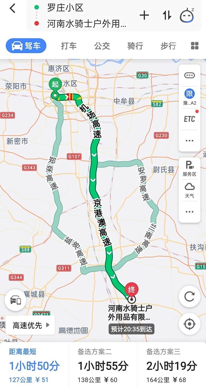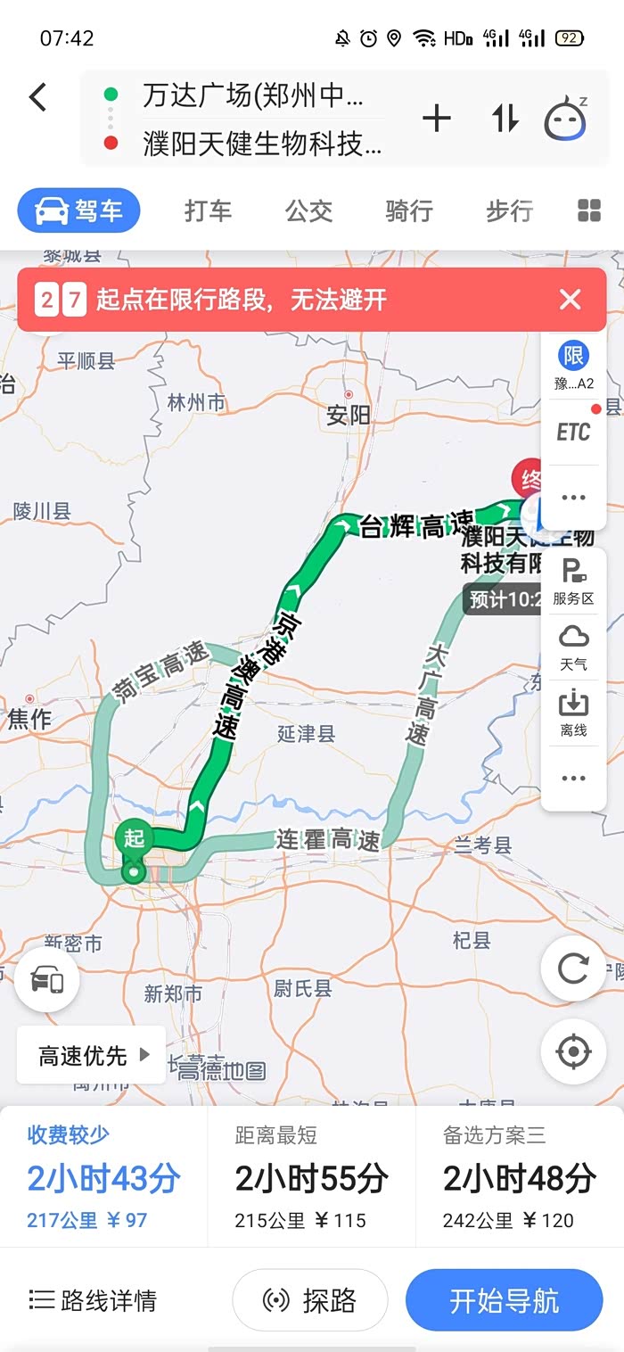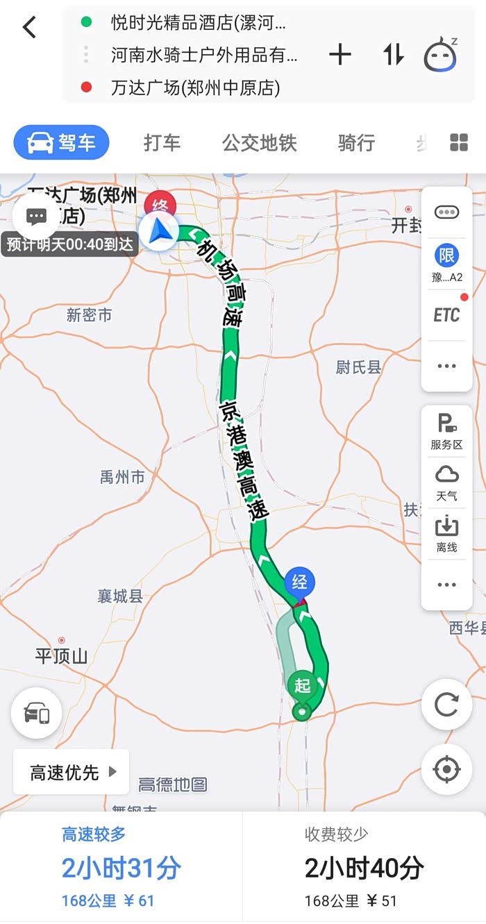 7月7号是周二,车子限行,也没开车。7月8号开车从郑州到漯河。