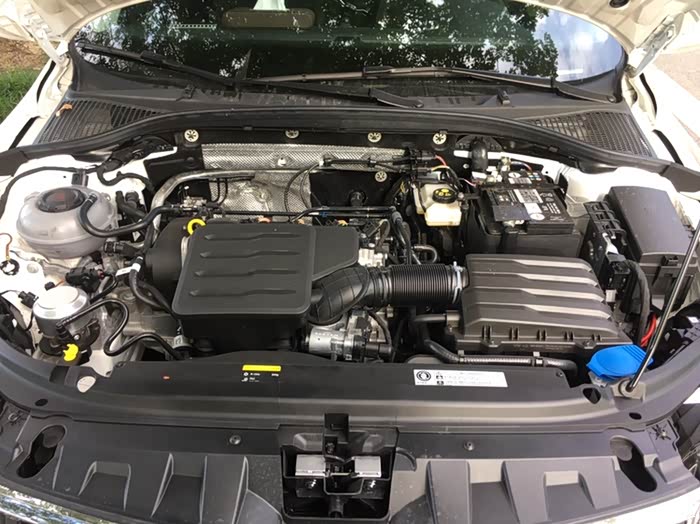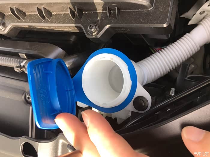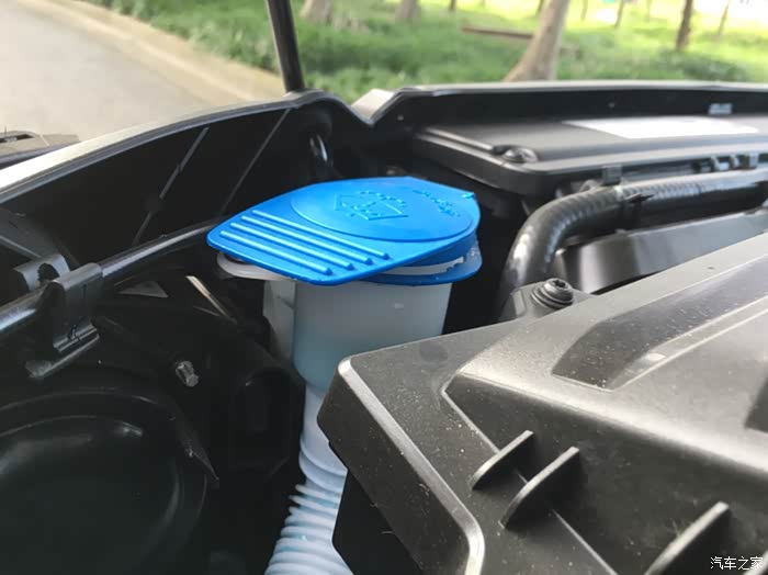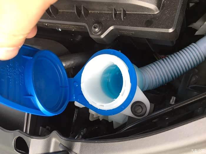 打开发动机舱,密密麻麻的都是官路,根本分不清哪是哪。注意找这个白色管子蓝色帽子的管子,玻璃水不用加太多,到刻度线就好啦,加太满容易溢出。千万注意玻璃水不能加错位置,加到机油那里或别的啥,车子就嗝屁啦。可以仔细看看蓝色盖子上的标识,一个前挡风玻璃,还有喷出的水,对,就是这里啦。最后,玻璃水不仅仅是只能用于清洁挡风玻璃,玻璃别的地方脏了,用玻璃水清洁,效果也很好哦