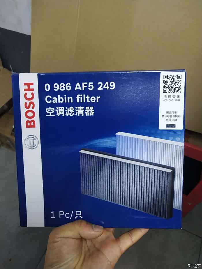 小哥帮我拿来了一个新的空调滤芯,牌子是博世的这牌子应该还可以