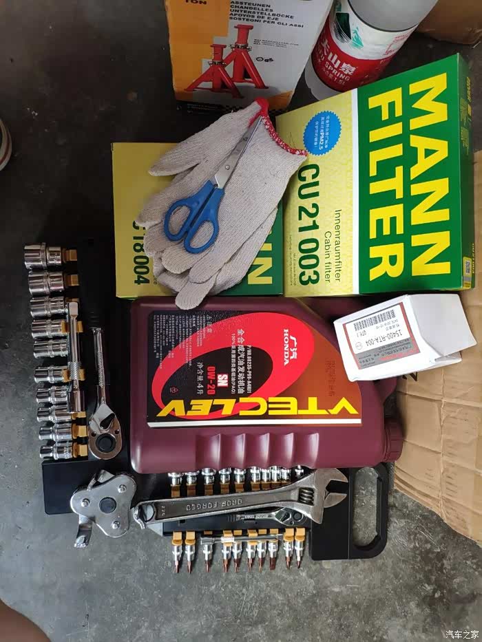 上网淘了保养所需要用到的工具和材料,就准备动手啦。主要用到的工具有机油保养架、保护支架、装废机油的容器、机滤扳手以及大小飞棘轮扳手套件。买了的耗材有广本红桶、广本机滤、曼牌的空滤和空调滤。有点效果,但还是不如当初6个那样省油
