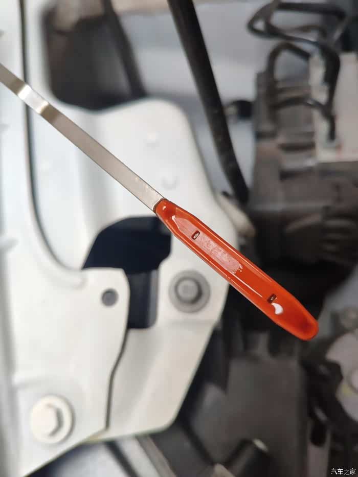 一切情况正常,把后轮的石头拿开,垫好机油保养架下的砖头,可以倒车下架子了。检测了一下机油尺的,在合理的范围内即可。哈哈哈