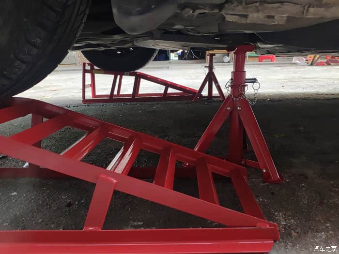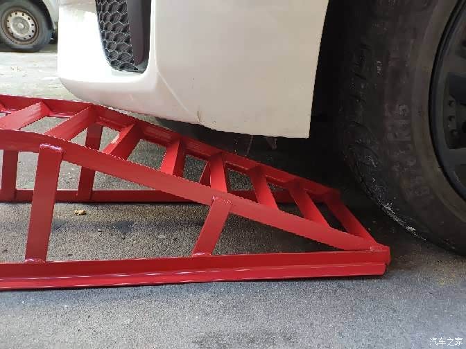 建议新手一定要准备一个漏斗!准备开上机油保养架的时候才发现小飞的车身低,前包围会顶着架子。于是乎,就找来两块砖头平放在车轮与架子的中间,减缓坡度。