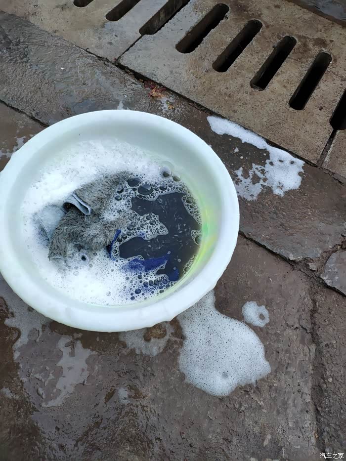 擦完车身洗帕子,水挺脏的。