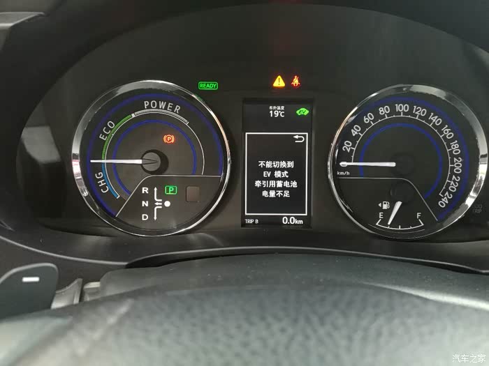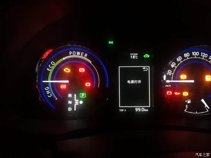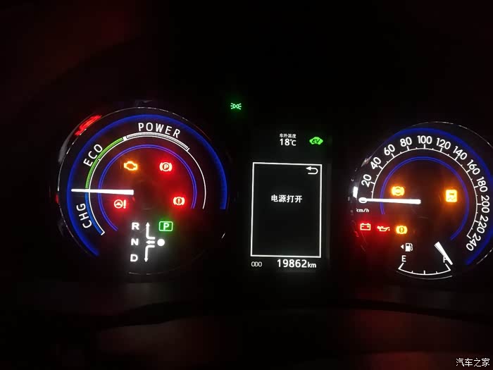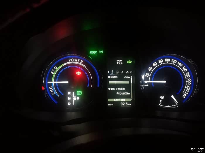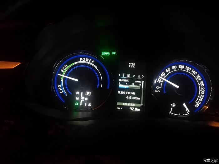 在时速20公里左右时发动机介入,可以看到瞬间油耗,EV字样也不见了。